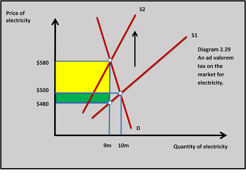 In diagram 2.29 an ad valorem tax of 20 per cent is put on the price of household electricity. Notice that when an ad valorem indirect tax is put on a good the supply curves diverge as the price increases.