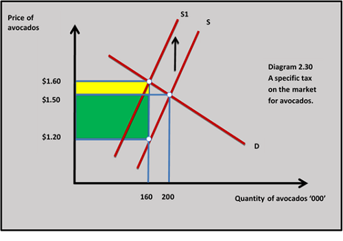 For example, if a tax is put on agricultural goods like avocados which is a luxury item where PED is relatively elastic and PES is relatively inelastic then the producer has a higher incidence of tax. In diagram 2.30 a tax of 0.40c is levied on avocados where the consumer has an incidence shown by the yellow area and the producer the green shaded area.