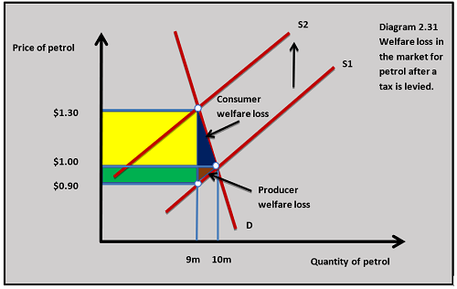 When a tax is applied to a good it will change the allocation of resources in the market. Diagram 2.31 shows the welfare loss associated with a $0.40 tax on petrol. This is made up of two elements: