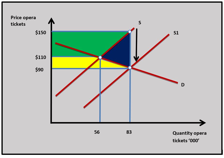 - Explanation that a subsidy on the market for the opera will mean lower prices for consumers and a gain in their consumer surplus which is shown by the yellow area in the diagram.
