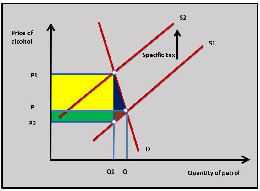 - Explanation that a specific tax on alcohol shifts the supply curve upwards by the amount of the tax and causes the price of alcohol to rise from P to P1 and the quantity traded to fall from Q to Q1.