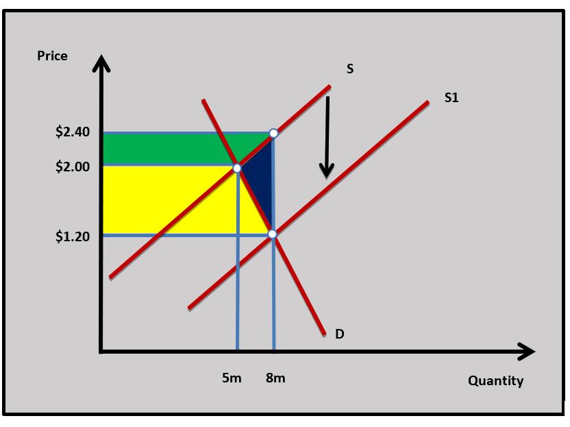 - The producer also benefits from subsidies because they receive an extra $0.10c per litre for the milk they sell. Their gain in producer surplus is shown by the green shaded area in diagram 2.32 and this is calculated as: ($0.10 x 10m) + ($0.10 x 1m/2) = $1.05m.