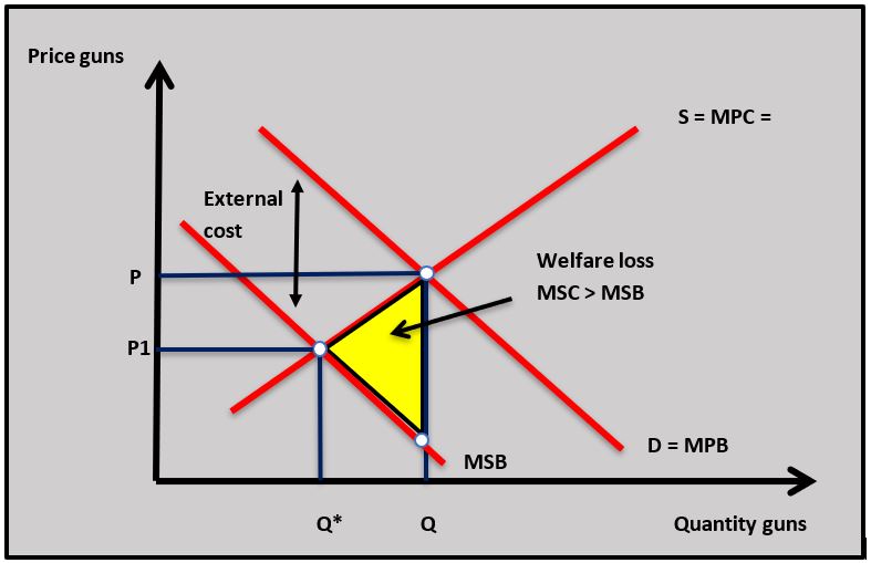 - An explanation that the negative externalities associated with gun ownership occur because of the spillover costs on third parties where people are the victims of gun crime and accidents. This means the MSB curve is below the demand curve and there is an over-allocation of resources at the market output of Q in the diagram. This means the market is not producing at the socially efficient output where MSC = MSB and there is a welfare loss shown by the yellow triangle.