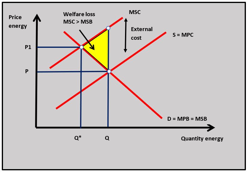 c. Using a diagram, explain how negative production externalities lead to market failure in the energy market. [4]