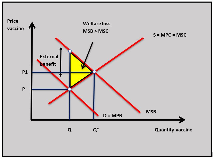 - An explanation that the positive externalities from the Covid19 vaccine result from the lower infection rates from vaccinated people who do not pass the virus onto others which reduces overall levels of covid. The positive externalities from the vaccine mean MSB is above MPB. This means there is an under-allocation of resources in a free market for the Covid19 vaccine where output is at the point where MPB equals MPC which is below the socially efficient output where MSC equals MSB. Because the MSB does not equal MSC the market fails and society's welfare is not maximised.