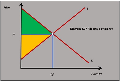 If all markets in the economy achieve maximum social/community surplus the welfare of a country’s citizens will be maximised. Diagram 2.37 show the maximisation of the consumer surplus (green area) and producer surplus (yellow area) at the equilibrium price. This is allocative efficiency because the social/community surplus is maximised.