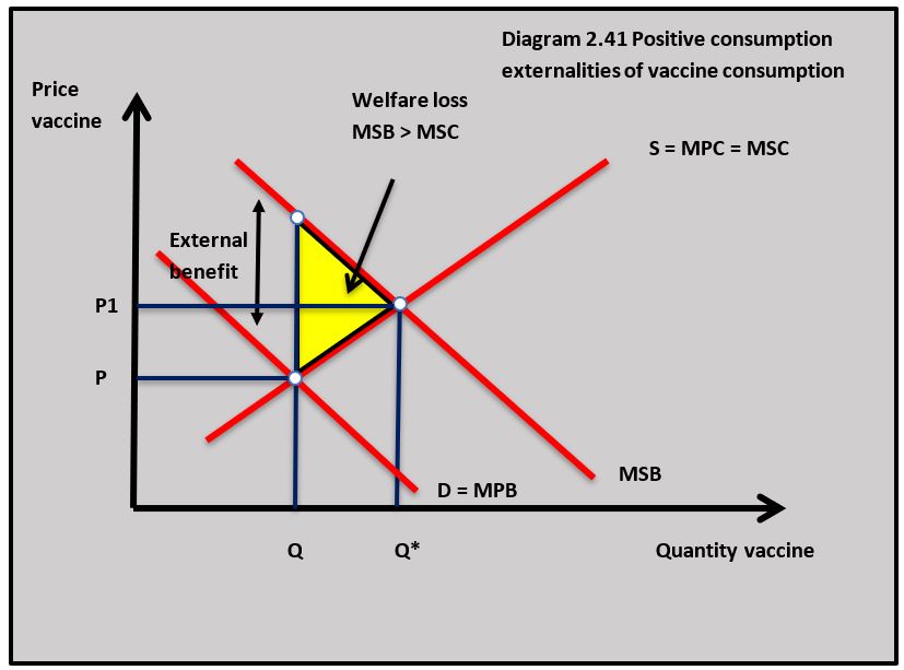 The yellow shaded triangle in diagram 2.41 represents the welfare loss to society from the flu vaccination. The marginal social benefit from the consumption of the vaccine is greater than the marginal social cost at each level of output from Q to Q*. This means from each extra unit of vaccine consumed between Q and Q*, the benefit to society is greater than its cost. By only producing at Q, society is missing out on the welfare from more resources being allocated to the market.