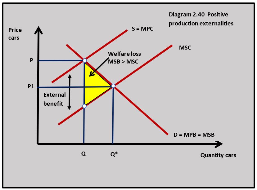 The yellow shaded area in diagram 2.40 is the welfare loss to society because of the under-allocation of resources. The marginal social benefit from the car factory is greater than the marginal social cost at each level of output from Q to Q*. For extra units produced from Q to Q*, the benefit to society is greater than the cost. By only producing at Q society is missing out on the welfare more resources being allocated to the market would bring.