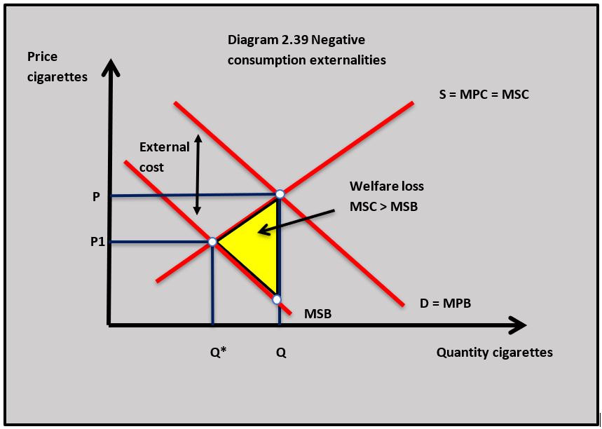 The yellow shaded area in diagram 2.39 represents the welfare loss to society from the over-allocation of resources in this example. At each level of output beyond Q* in diagram 2.39, MSC is greater than MSB which means that the cost to society of each extra unit of cigarettes consumed is greater than the benefit.