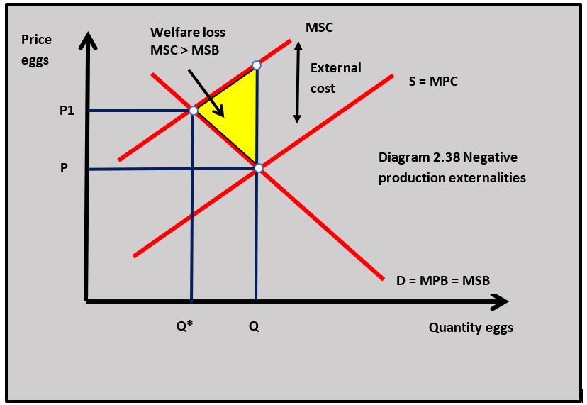 A welfare loss to society occurs in a market when the output of a good or service means the social cost of production is greater than the social benefit of production. The yellow shaded area in diagram 2.38 shows the total welfare loss in the egg market example. At each level of output beyond Q* in diagram 2.38, MSC is greater than MSB, which means that the cost to society of each extra unit of eggs produced is greater than the benefit.