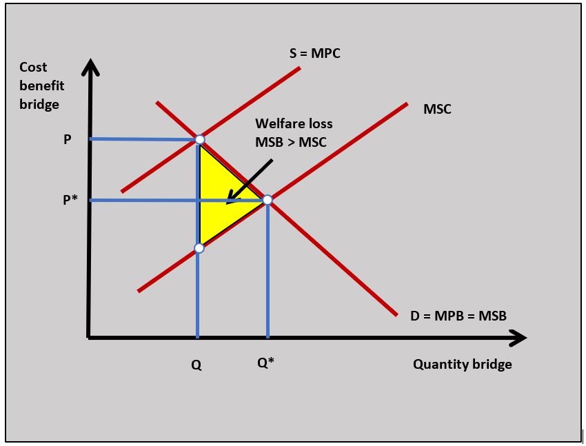 - An explanation of that the external benefits associated with the Macau bridge will mean that in a free market situation the bridge may not have been built and the socially efficient level of output would not be achieved and this would lead to a market failure. The welfare loss associated with the Macau bridge is shown by the yellow shaded area in the diagram.