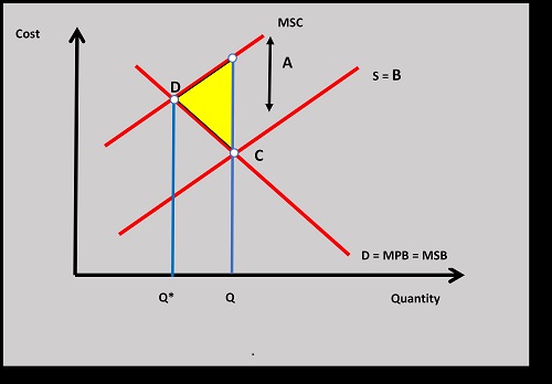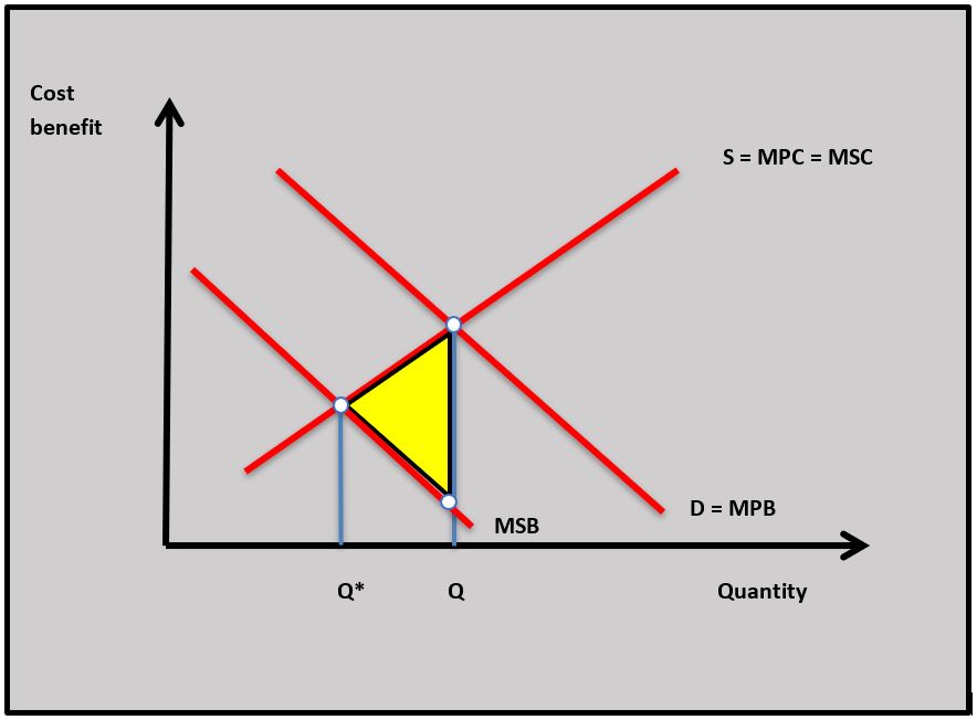- A diagram to show the external costs of consumption leading to market failure because there is an over-allocation of resources. This is shown in the diagram attached where the socially efficient output (MSB = MSC) at Q* is below the market output Q which leads to an over-allocation of resources.