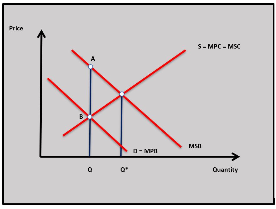 When there are external benefits of consumption it means social benefits are greater than private benefits.