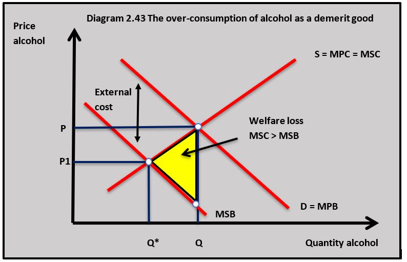 Diagram 2.43 shows how the over-consumption of alcohol and the associated welfare loss.