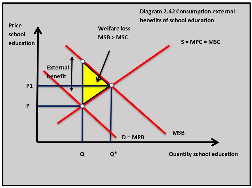 When people are deciding to send their children to school, they do not consider the external benefits of school education. There are significant positive externalities associated with children attending school: they provide a more skilled workforce; they learn social skills that make them better citizens and they are likely to be healthier because they are taught how to live healthy lives. Diagram 2.42 illustrates the under-consumption of school education and its associated welfare loss.