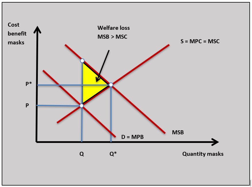Because of the positive externalities associated with face masks, the market output in the diagram (MPB equals MPC) at Q is below the socially efficient output (MSB equals MSC) at Q*.