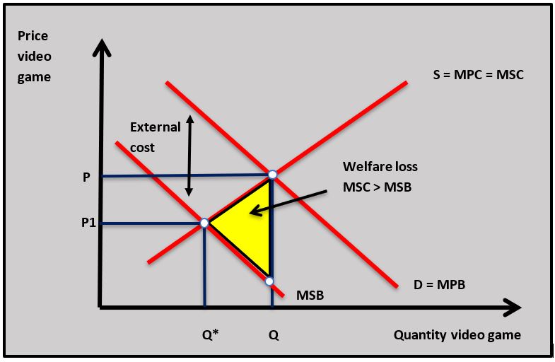 - The yellow shaded area is the welfare loss associated with the consumption of violent video games.