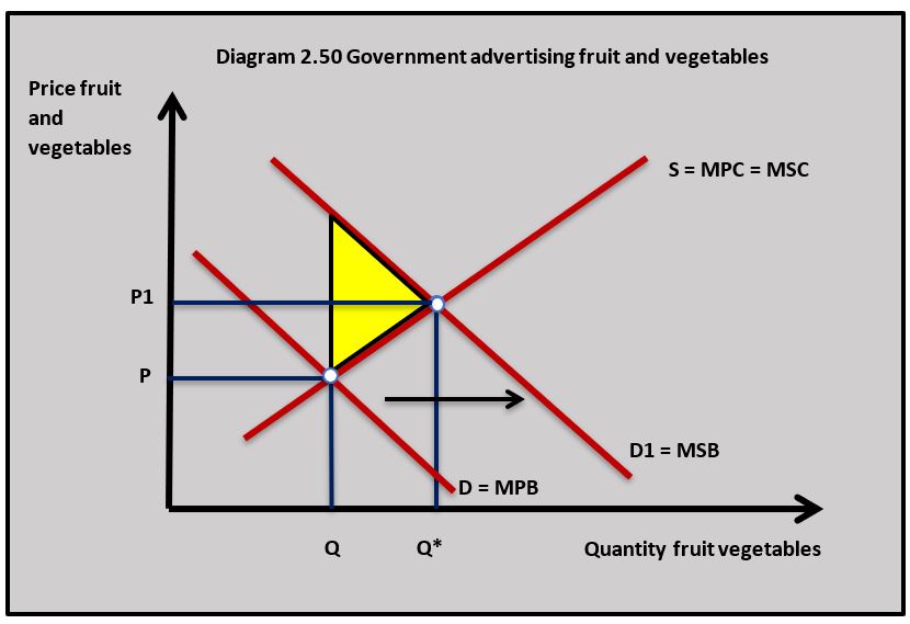 Diagram 2.50 illustrates the impact of a government advertising campaign to increase the consumption of fruit and vegetables as part of a healthy living policy. The demand curve for fruit and vegetable shifts to the right and market output increases from Q to Q1 which is closer to the socially efficient output Q*. As a result, some welfare is gained and is shown by the yellow area on the diagram.