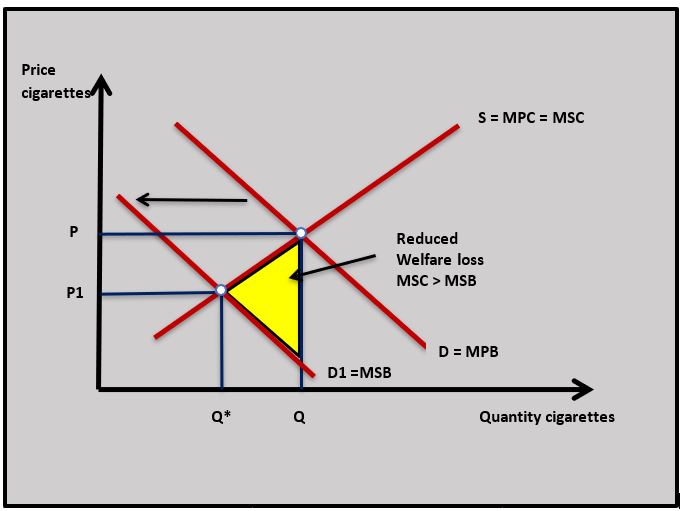 - A diagram to show how regulation would reduce the demand for cigarettes and move market output closer to the socially efficient level. This is shown in the diagram where demand shifts from D to D1 and output falls to the socially efficient level at Q*.