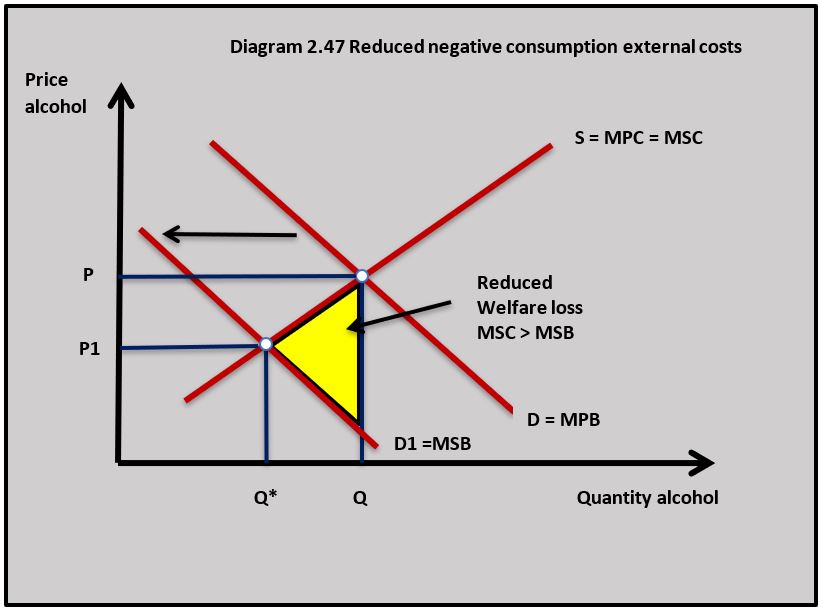 Diagram 2.47 shows how an effective advertising campaign against drinking alcohol reduces its demand, which in turn reduces the external cost associated with its consumption. In this example, the welfare loss is removed as D shifts to D1.