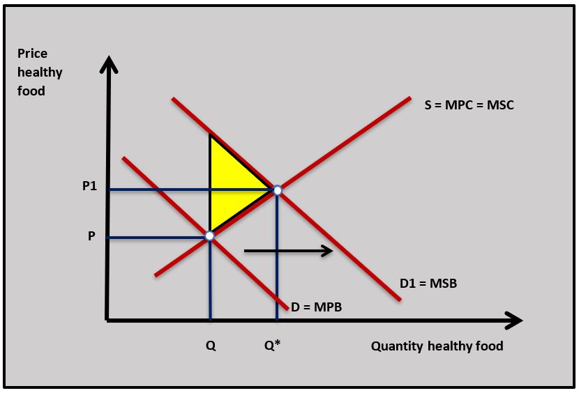 - An explanation that the subsidy on healthy food will increase output in the market for healthy food to the socially efficient level.