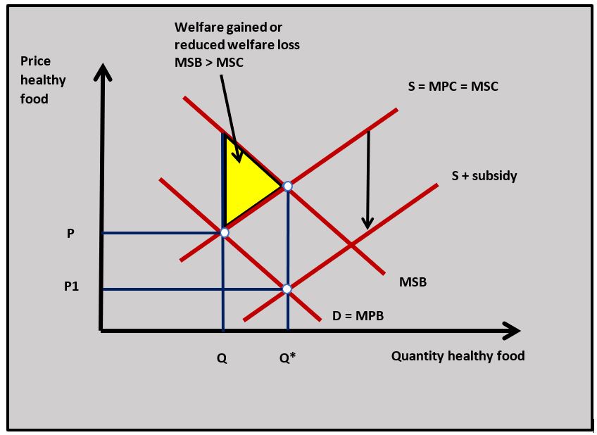 - A diagram to show the impact of subsidies on the market for healthy food. In the diagram shown the subsidy applied increases supply and this increases output to the socially efficient level at Q*.