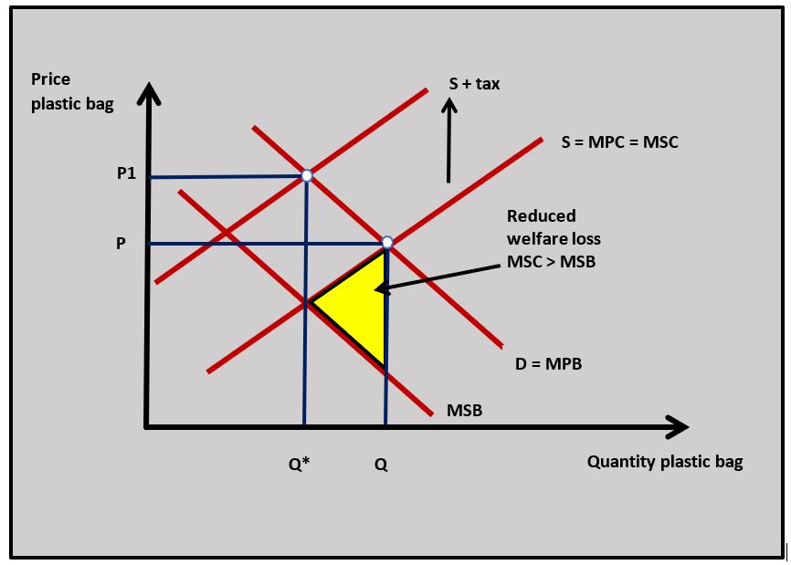 The 10p tax on plastic bags would shift the supply curve for the bags upwards by the amount of the tax and cause quantity demanded to fall and output of plastic bags to decrease to the socially efficient output at Q* in the diagram.