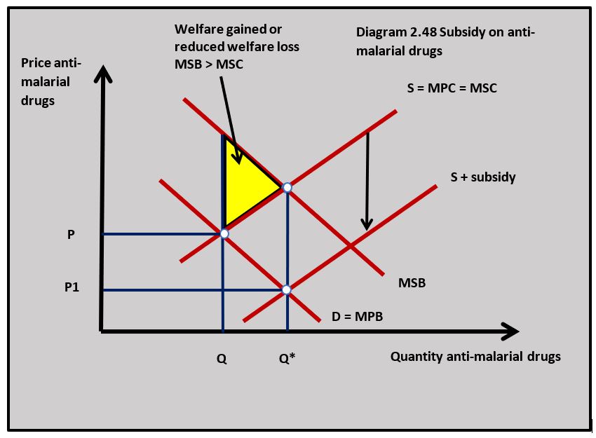 Diagram 2.48 shows the impact of the subsidy on anti-malarial drugs. Initially, the market output is at Q below the socially efficient level at Q*. There is a potential welfare gain equal to the yellow shaded area. When the subsidy is added by the government the price falls from P to P1 and output rises to the socially efficient level at Q* and welfare is gained.