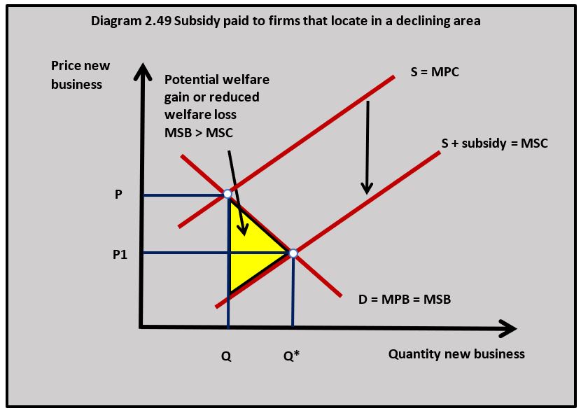 By subsidising the production of a good with positive externalities firms are encouraged to increase output towards the socially efficient level. Subsidies are often paid to firms who locate in areas of industrial decline because the positive externalities of their location help to stimulate regional economic growth. Diagram 2.49 illustrates the effect of a subsidy paid to businesses that locate in an area that has suffered from significant industrial decline. The price falls from P to P1 and output increases to the socially efficient output at Q*.
