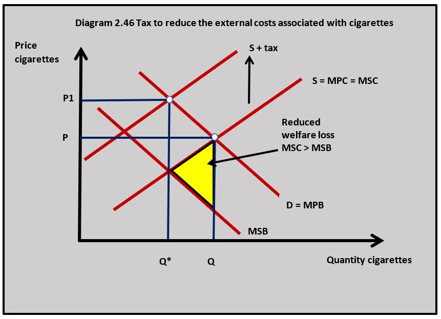 Tax can also be imposed on negative externalities of consumption. In many countries governments tax cigarettes to reduce their consumption and the associated social costs. Diagram 2.46 illustrates the impact of an indirect tax on cigarettes. The effect is similar to a tax on good on negative externalities of production, with the price of cigarettes increasing to P1 and the output of cigarettes being reduced from Q to Q* at the socially efficient output. The tax removes the yellow welfare loss triangle.