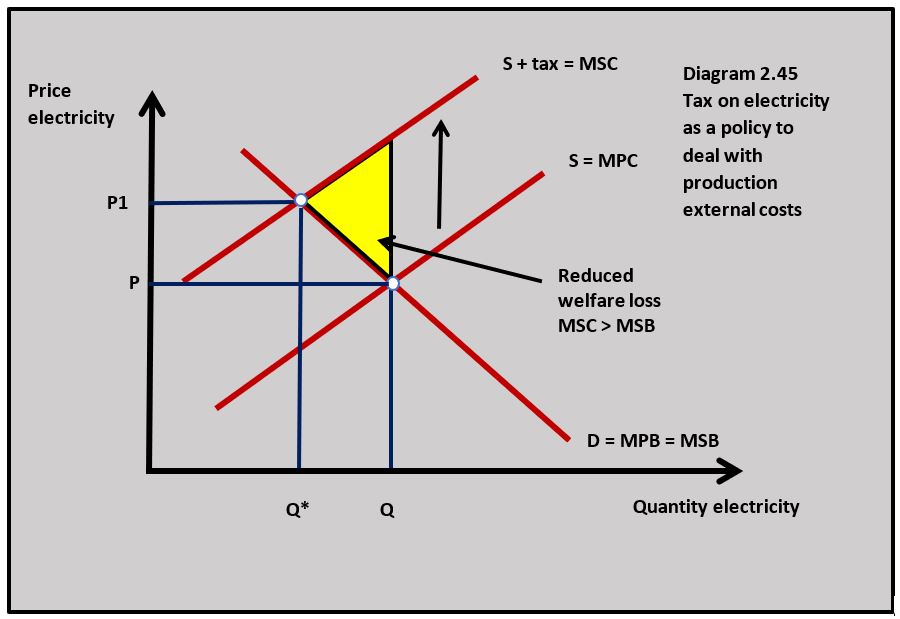 Where an industry is associated with significant negative externalities governments can impose indirect taxes on producers. An indirect tax adds to business costs causing an increase in the price of the good and leading to a fall in output towards the socially efficient level. This is illustrated by diagram 2.45, where an energy company pays a specific tax on the electricity it produces.