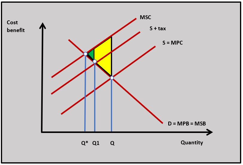 In this example, the tax increases the market price to P1 and moves output from Q to Q1 which is at the socially efficient output at Q*. This removes the welfare loss associated with the electricity industry, although it should be pointed out that in reality achieving the exact socially efficient output is impossible.