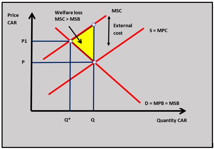 • A diagram to show how taxation can be used to reduce air pollution. This is shown in the diagram where the tax reduces the market output Q to the socially efficient level at Q*.