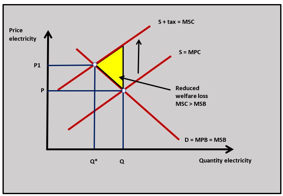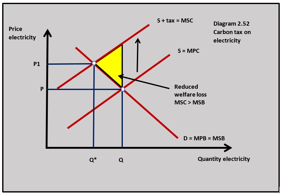 Diagram 2.52 illustrates how a carbon tax affects the market for electricity. The tax causes the supply curve to shift to the left and cause the market price to rise to P1 and output Q to shift to Q1 which is closer to the socially efficient output at Q*. The welfare loss triangle is reduced from the yellow shaded triangle to the smaller green triangle.
