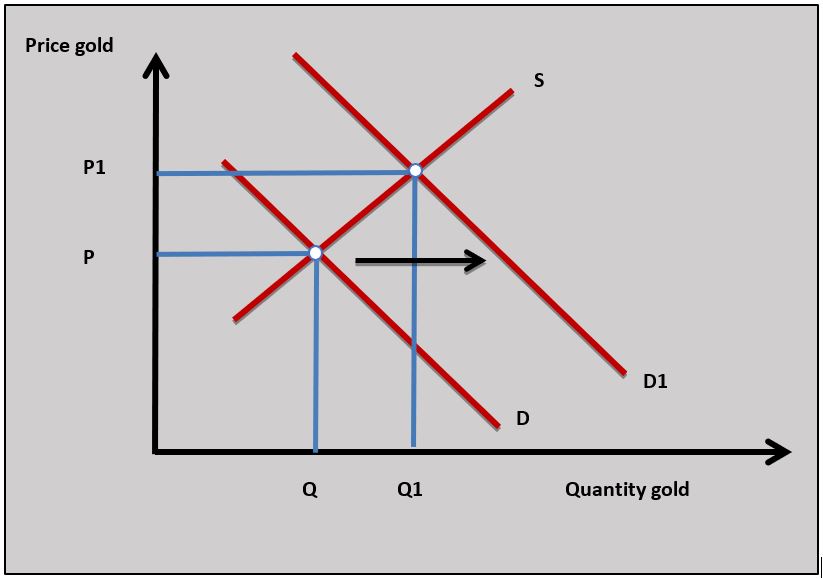 The diagram shows how an increase in the demand for gold leads to an increase in its price from P to P1. The higher price of gold is an incentive for gold miners to increase the amount of gold they produce through illegal mining.