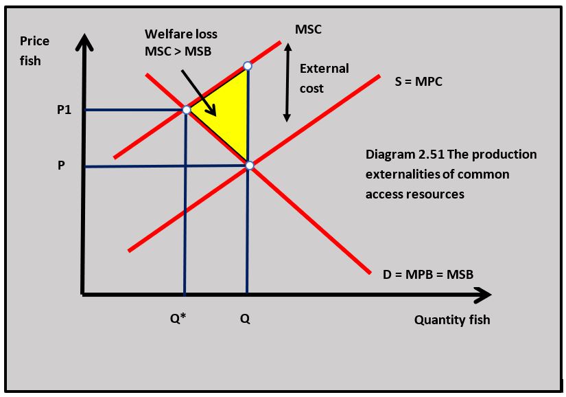 Diagram 2.51 illustrates the external costs of overfishing the sea. The market output is at Q which is above the socially efficient output of Q*. There is an over-allocation of resources and the yellow shaded area represents the welfare loss to society.