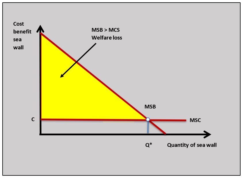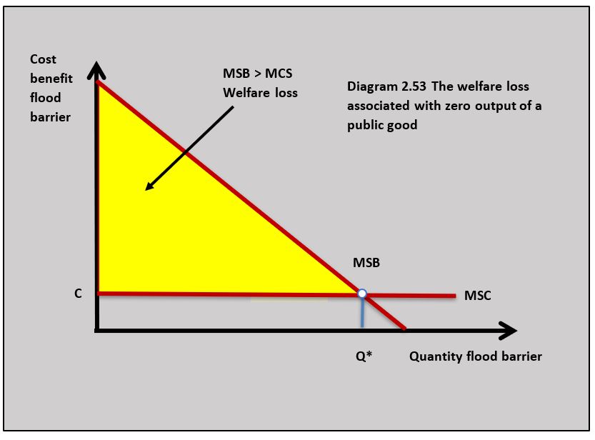 Diagram 2.53 shows how the socially efficient output of the blood barrier at Q* where MSB equals MSC. The MSC curve in this case is horizontal at C because the marginal cost of an additional user of a flood barrier is zero. Once the flood barrier is set up the marginal cost of providing it to each additional consumer does not change as more consumers benefit from it. If the flood barrier costs $1Bn the cost will not change if two million people benefit from it or three million people benefit from it. Remember, this is hypothetical because in a free market the flood barrier would not be built. Because the output is zero in the market the whole yellow shaded area is the welfare loss.