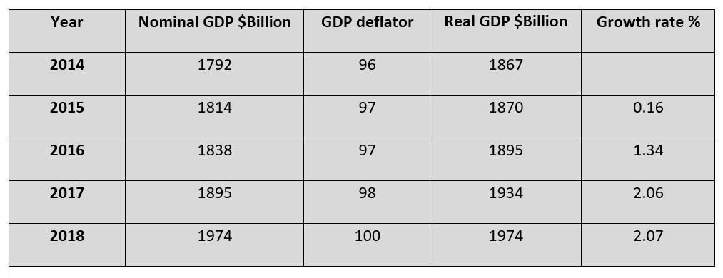 Calculating real GDP is done by dividing the nominal GDP by the GDP deflator and multiplying by 100. The table below sets out the GDP data for a country. For 2014 the real GDP is: