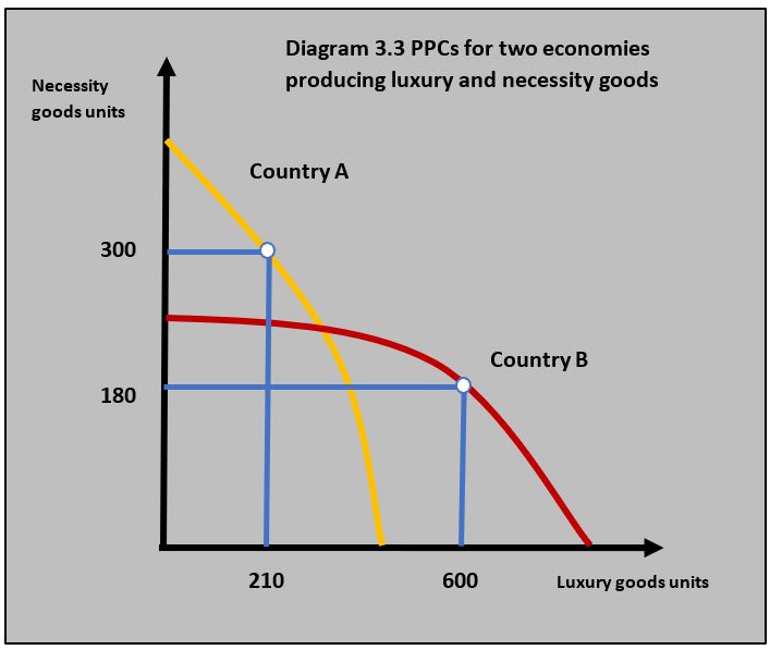 Diagram 3.3 shows the production possibility curves for two economies, country A and country B. Country A could be said to have higher welfare amongst its citizens relative to country B because it allocates more resources to necessity goods.