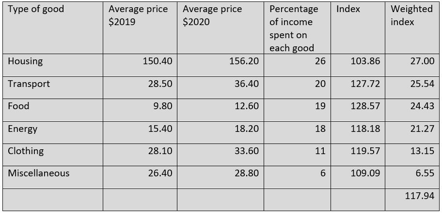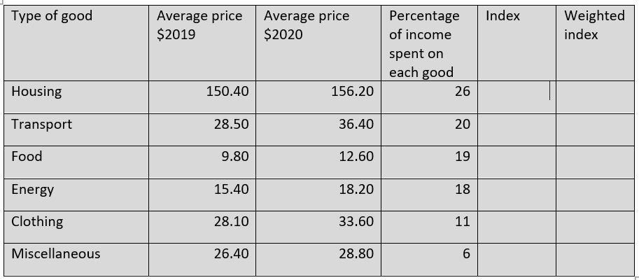 c. Calculate the weighted price index value for 2020 based on the data in the table. [4]