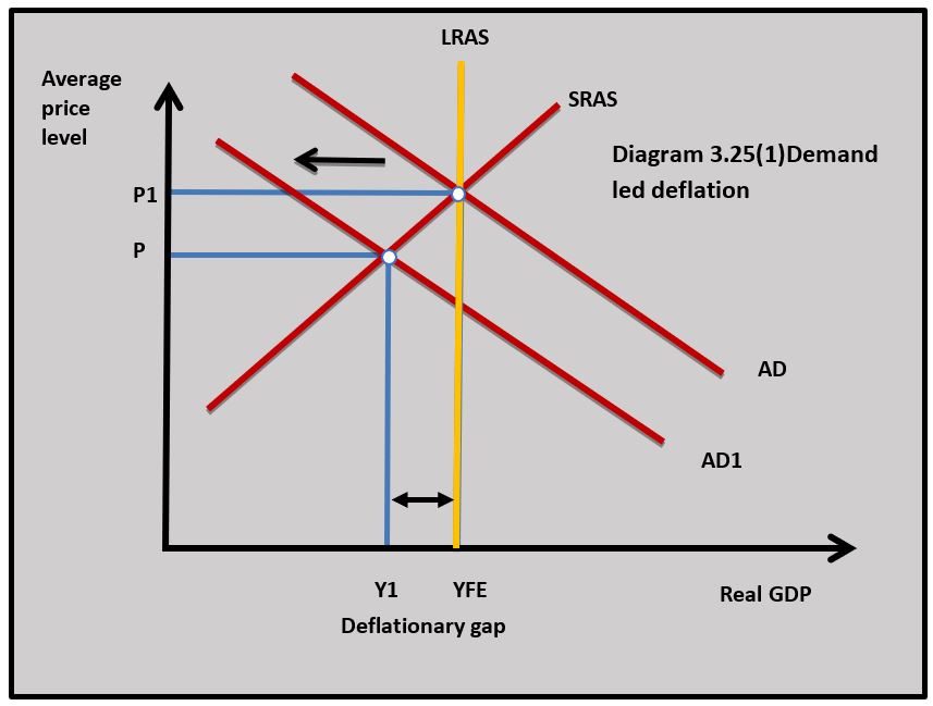 Deflation can occur because of a fall in aggregate demand and this typically occurs in a recession. The Japanese have experienced periods of deflation in the last 20 years caused by falling aggregate demand. Diagram 3.25(1) illustrates how a fall in aggregate demand from AD to AD1 leads to deflation as the average price level falls and there is a deflationary gap. Because this type of deflation occurs in a recession it is seen as damaging to the economy in terms of falling GDP and rising unemployment. Economists sometimes call this ‘bad deflation’.