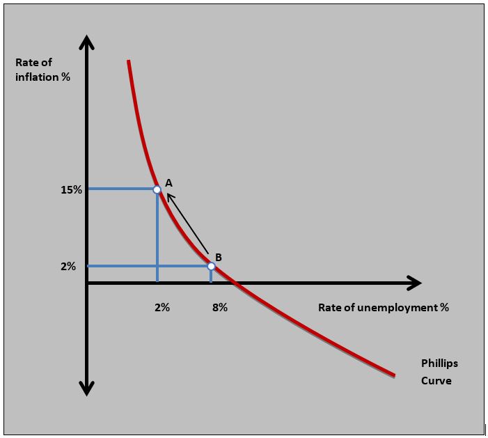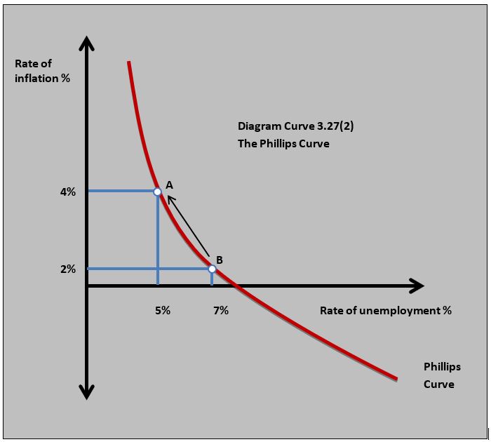 Phillips used the UK data to establish that as the rate of inflation decreased the rate of unemployment increased and as the rate of inflation increased the rate of unemployment decreased. Diagram 3.27(2) illustrates the basic Phillips Curve.