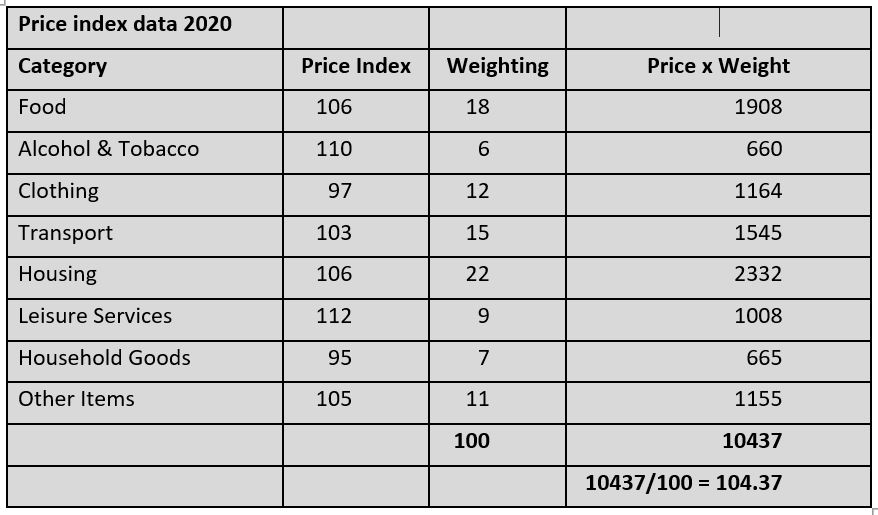 Step 4 Each category of good in the price index is multiplied by its weighting. The sum of price multiplied by weighting for each category divided by 100 gives the weighted index.