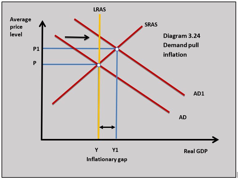 Demand-pull inflation occurs when a rise in aggregate demand in the economy causes (pulls) the price level in the economy to increase. Diagram 3.24 illustrates how a rise in aggregate demand from AD to AD1 leads to a rise in the average price level from P to P1.