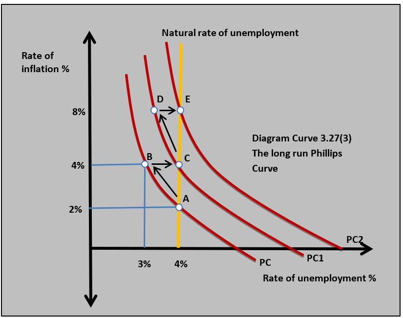 - The 8 per cent rate of inflation becomes expected by firms and households and in the long-run unemployment drifts back to its natural rate of 4 per cent at point E in diagram 3.27(3).