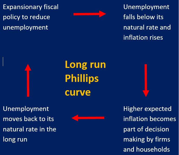- This process continues each time the government uses expansionary fiscal policy to reduce unemployment and the economy experiences higher and higher inflation with no long-term fall in unemployment.