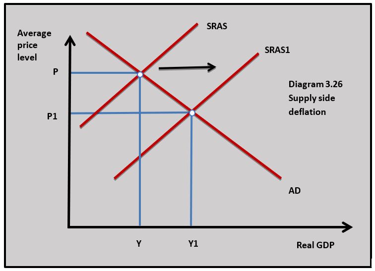 Deflation that occurs on the supply side arises when the aggregate supply curve shifts to the right and leads to a higher output at lower prices. Improvements in productivity in manufacturing have led to significant falls in prices in certain markets and this has had a ‘deflationary effect’ on the economy. In diagram 3.26 the short-run aggregate supply curve shifts from SRAS to SRAS1 and the average price level falls. This is often called ‘good deflation’ because it is associated with a higher level of real GDP.