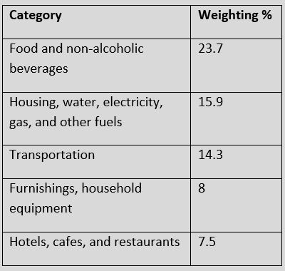 Turkey’s current consumer price index (CPI) value is 460 with a base year value of 100 starting in 2004. The weighting value of the 5 most significant product categories in Turkey’s CPI is set out in the table opposite.