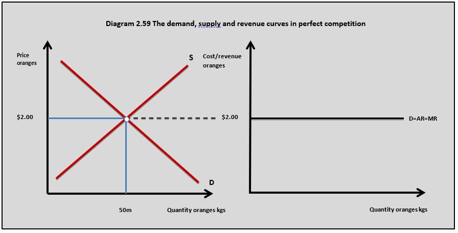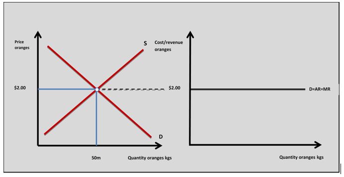 In the orange market example, each farm has to charge $2.00 per kilo which equals the average revenue and marginal revenue for each firm in the market.