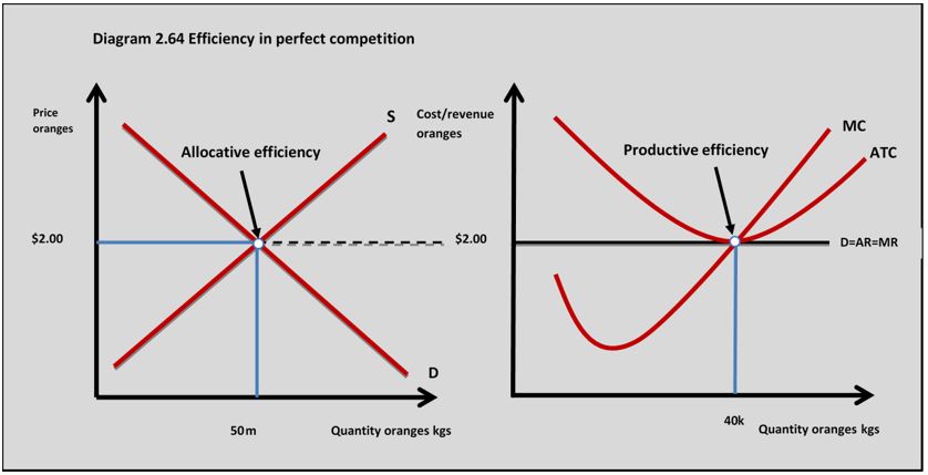 This is achieved in perfect competition when firms are making normal profits, but not abnormal profit or losses. This is shown in diagram 2.64 at output of 40,000 kgs.